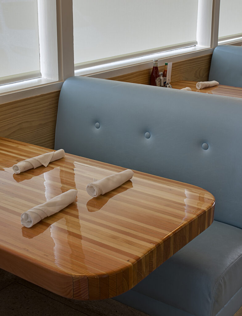 A googie-style, mid century modern treasure, the Welcome Diner has restored this Tucson landmark its original glory with some added zing. The original terrazo flooring and bar seating was retained, complemented by new custom glulam countertops and tabletops.