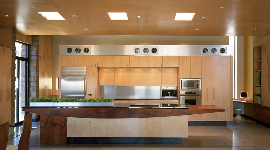 The Downing residence, located in the Tucson Mountains, challenged our construction team to think creatively to successfully blend the rambling masonry pavilions into the sloping site while minimally disturbing the precious native desert. The project features a soaring steel butterfly roof over exposed masonry, concrete, and steel. Plywood ceilings and custom birch millwork is incorporated throughout. A project highlight is the floating steel powder room that emerges from the masonry mass, capturing sweeping city views. The house received an Honor Award from the Masonry Guild of Arizona for excellence in masonry construction.