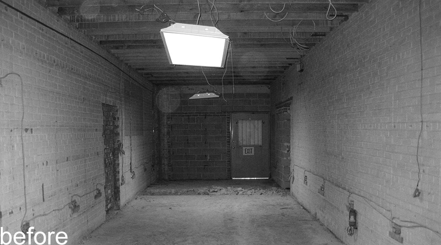 materials: sand blasted block, exposed wood ceiling, smooth finish drywall, raw steel, maple plywood