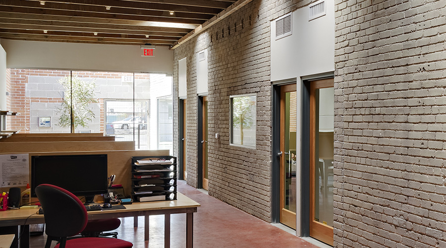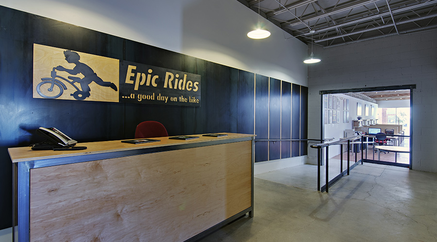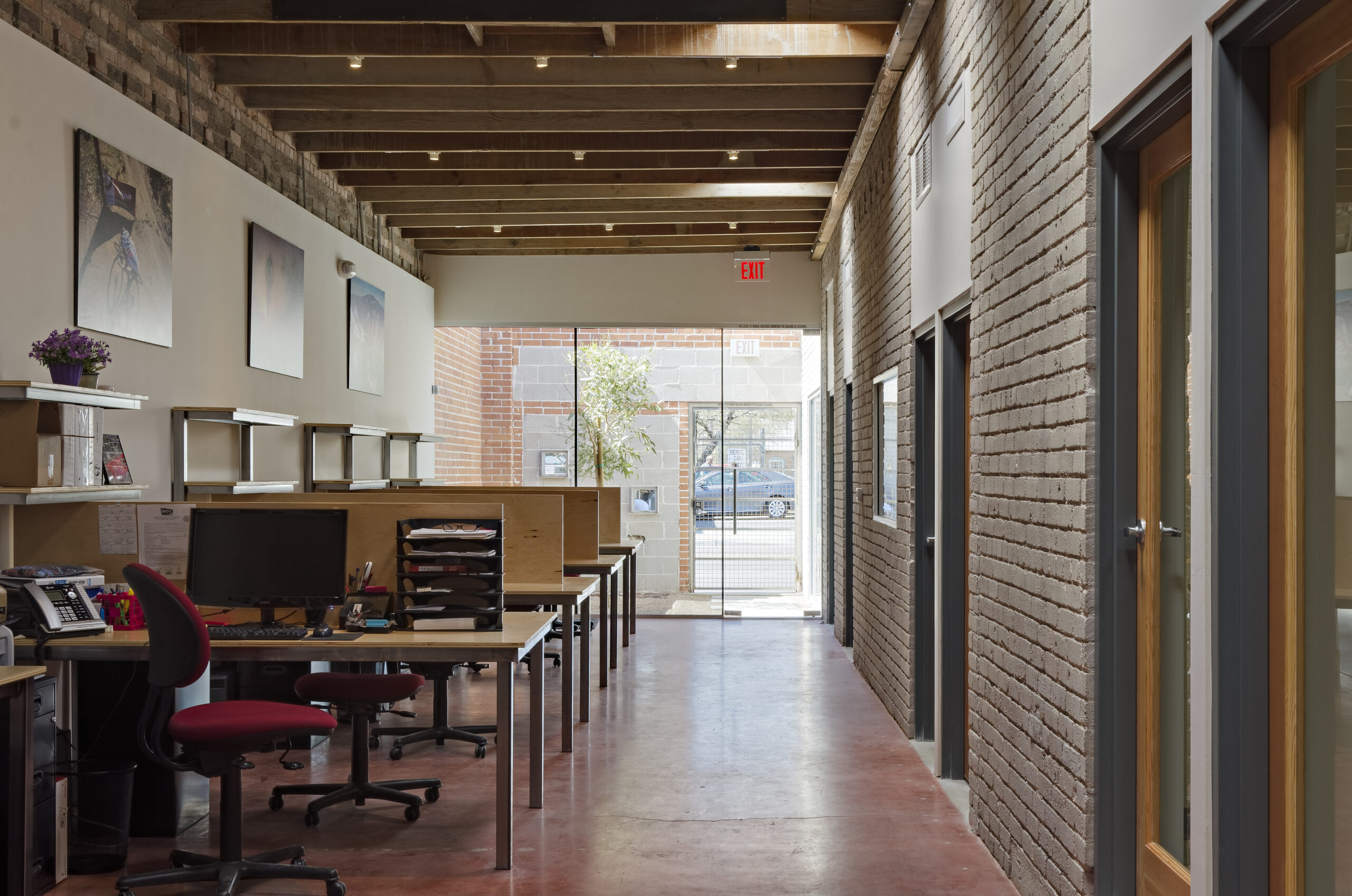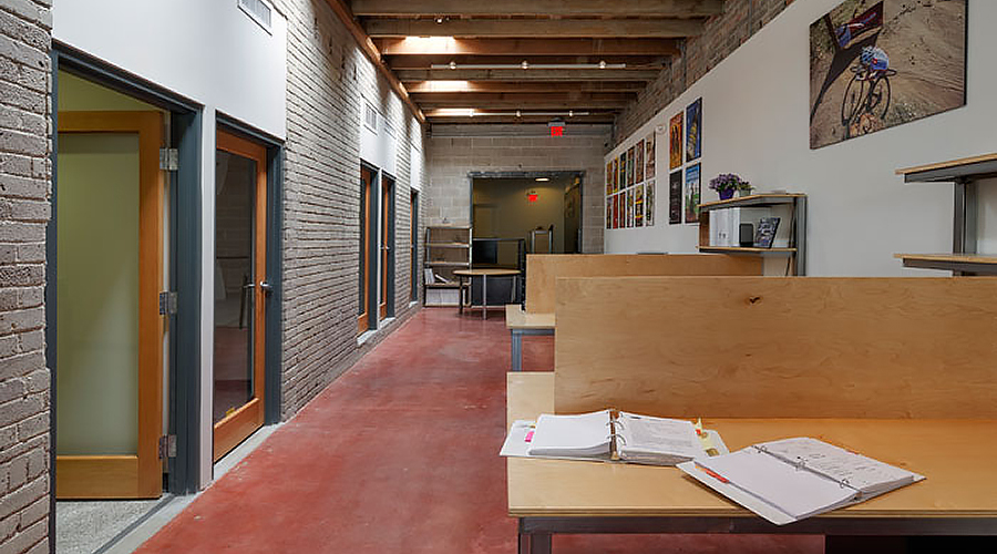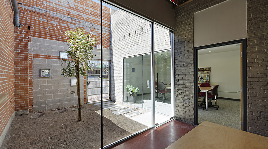 A run-down warehouse in downtown Tucson is transformed into a new office space for a fast growing mountain bike event company. Natural light is drawn into the space by a 14′ x 14′ courtyard inserted into the building. The existing brick walls, tongue & groove wood ceiling and iron oxide pigment floors were stripped back and revealed. Steel, birch plywood and smooth drywall create the new work environment.