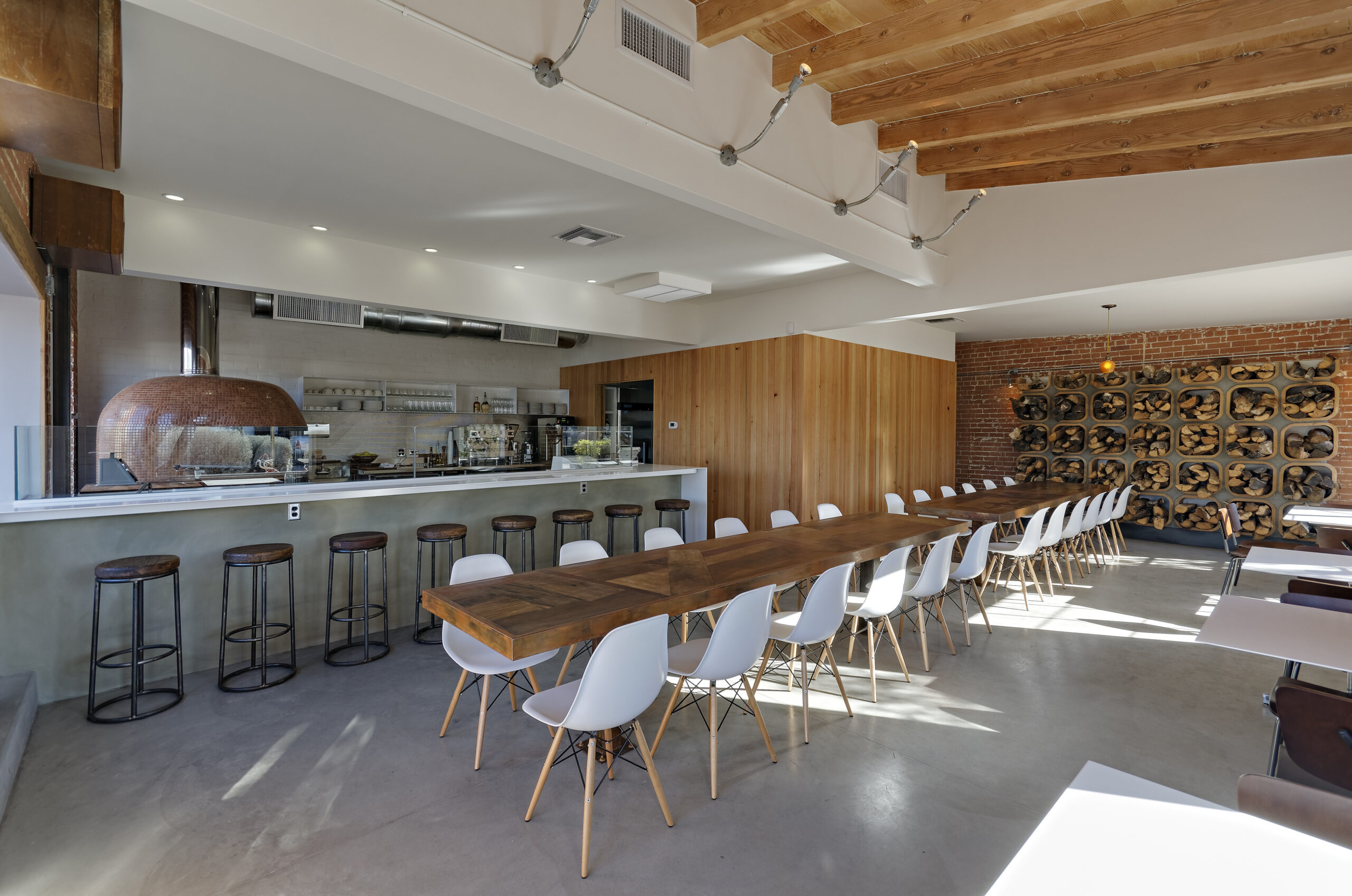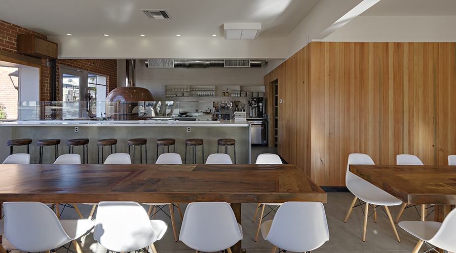 The interior palette—clay products and exposed Douglas Fir—echoes the wood-fired cooking process, while powder-coated white steel offers a modern interpretation of traditional Italian marble slabs.