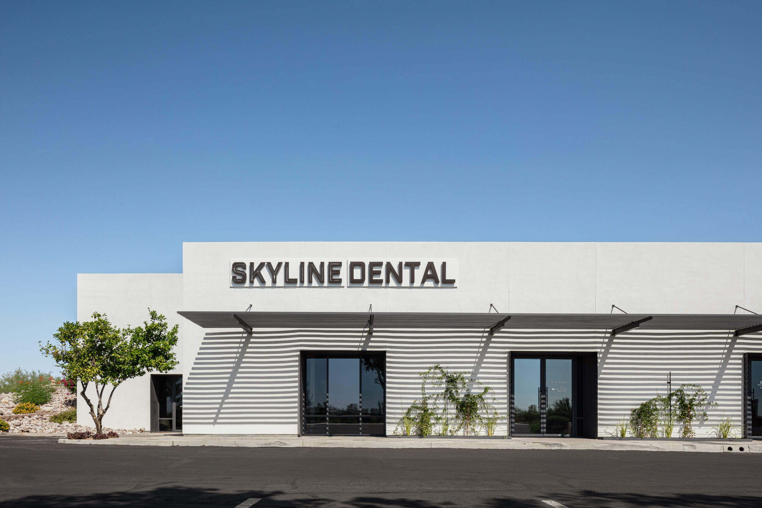 The interplay between the solid, grounded stucco and the precise, elevated steel creates a dynamic aesthetic that defines the new identity of the row.