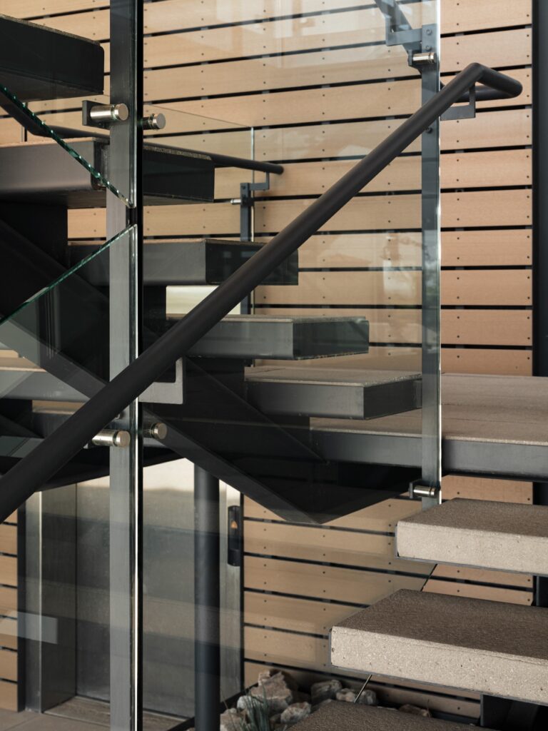 + Composite Wood Slat Screens: Adding warmth and texture to the industrial steel.