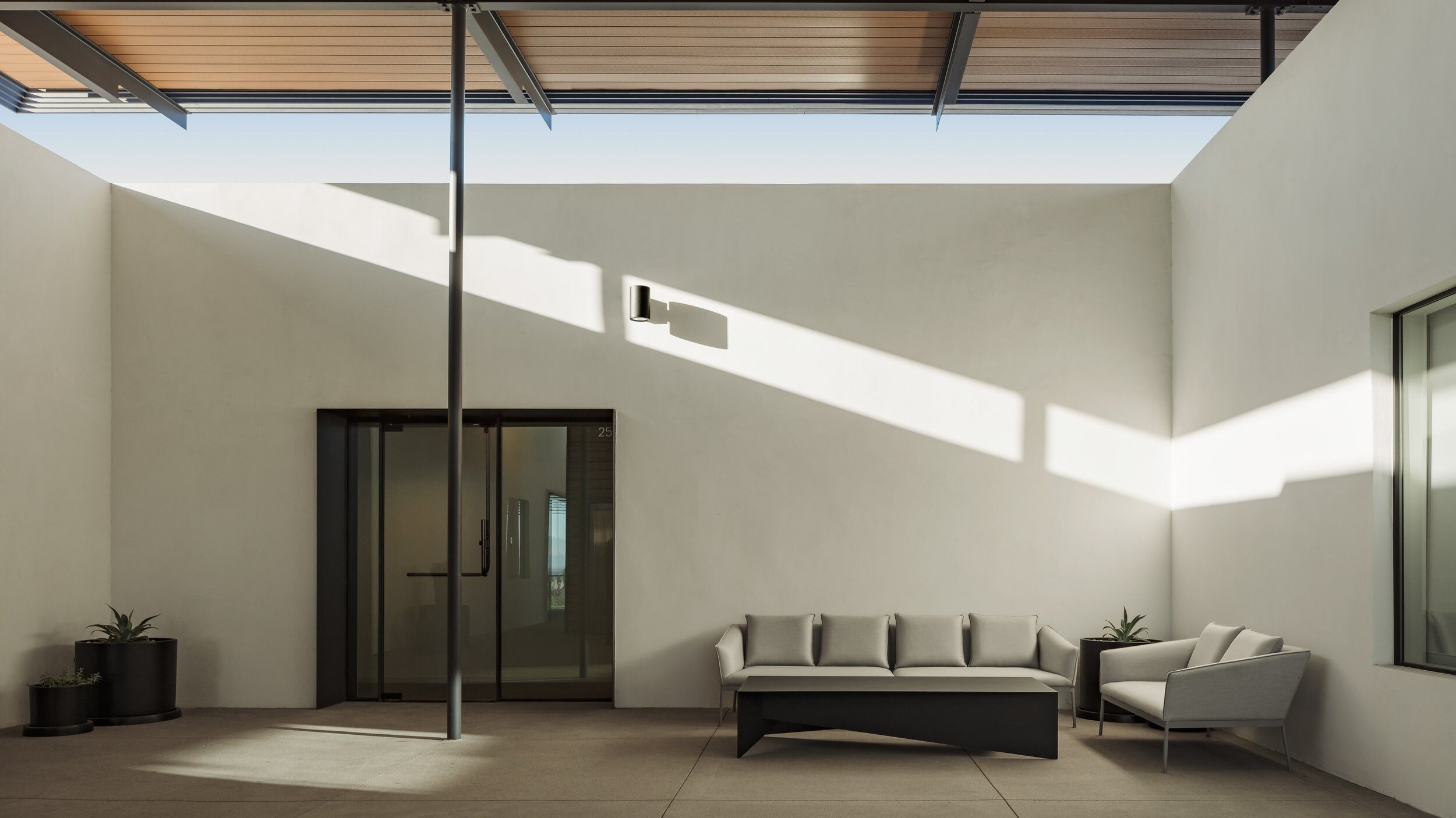 materials: concrete, steel, stucco, wood cladding