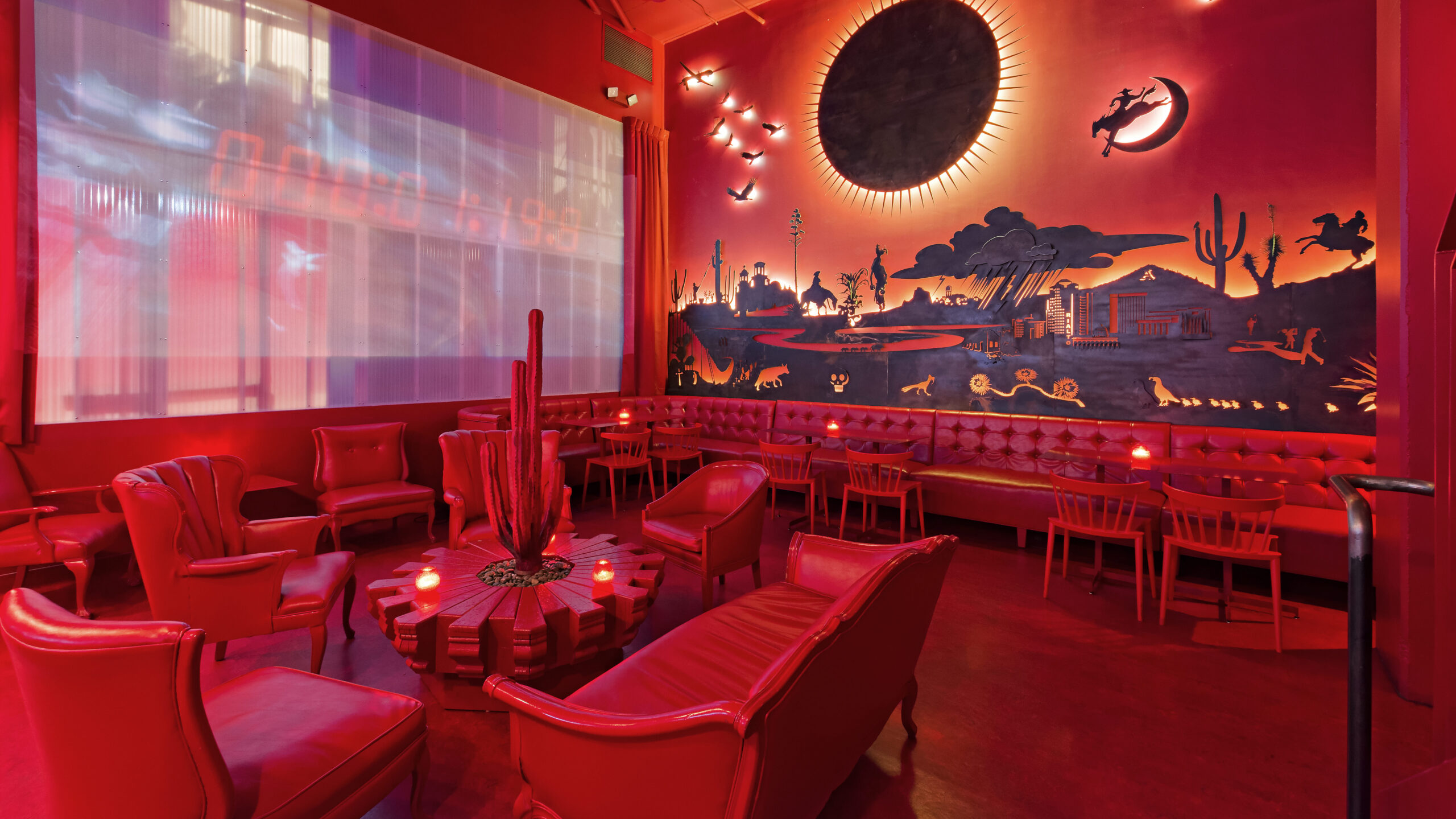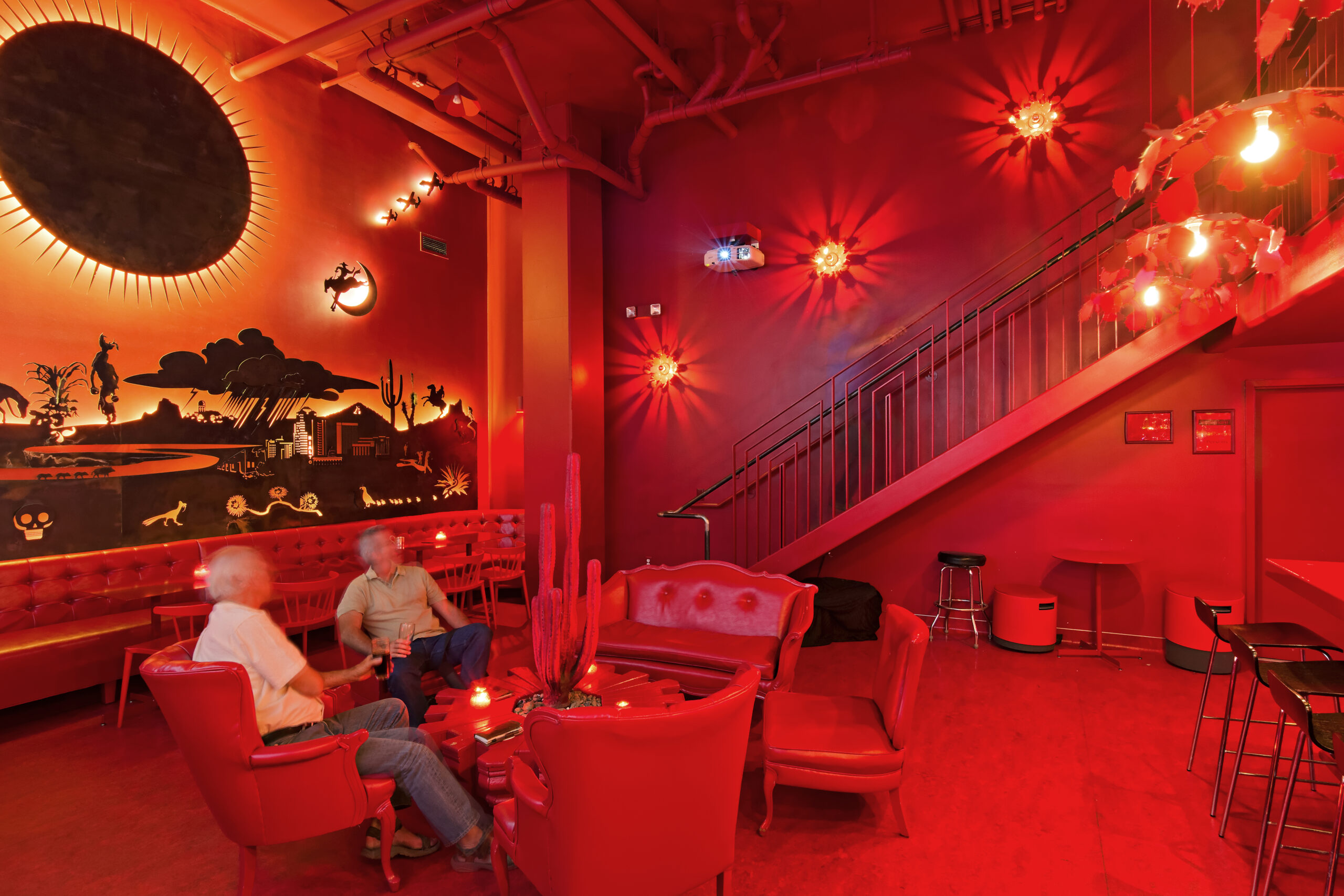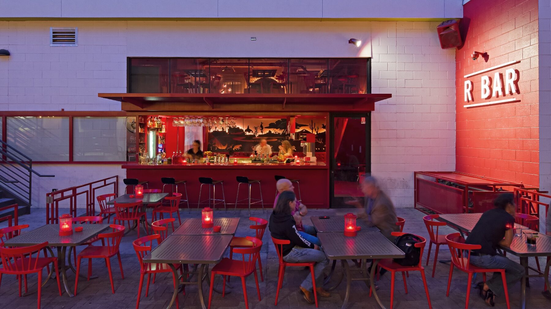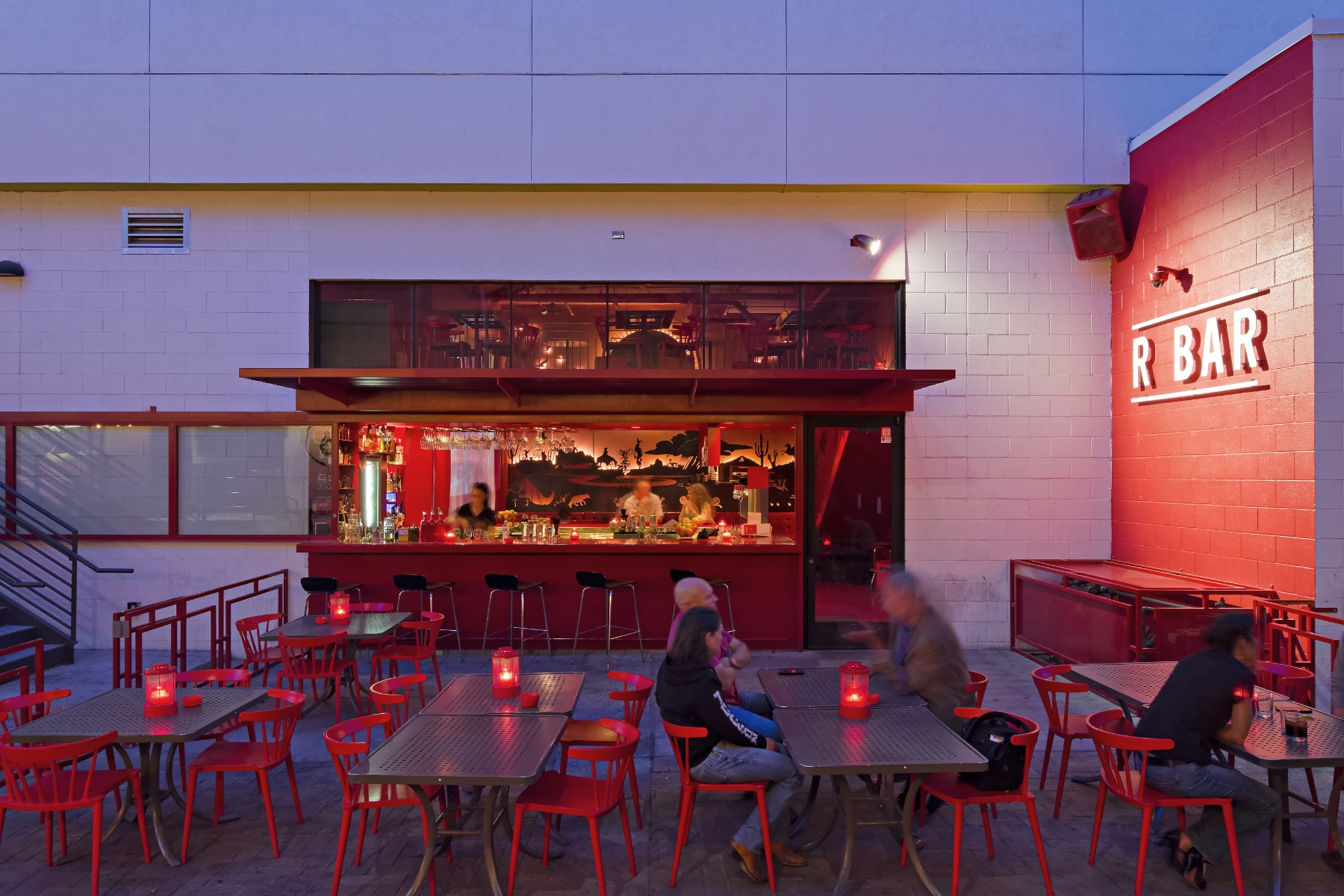 R Bar is the Rialto Theatre’s 7-night-a-week “alley bar” located in downtown Tucson. Patrons enjoy cocktails, beer and wine in a one-of-a-kind, funky-chic, setting. From the floors to the ceiling and everything in between, the entire interior of r bar is painted a rich crimson hue. Custom steel detailing is found throughout the space, with the focal point being “The Story of Tucson”, a 10’ high laser cut steel wall mural depicting notable Tucson landmarks, plants and animals native to the Sonoran desert. The mezzanine level above the bar provides a more intimate setting, while downstairs in the main space. a translucent projection wall shows classic movies every night of the week.