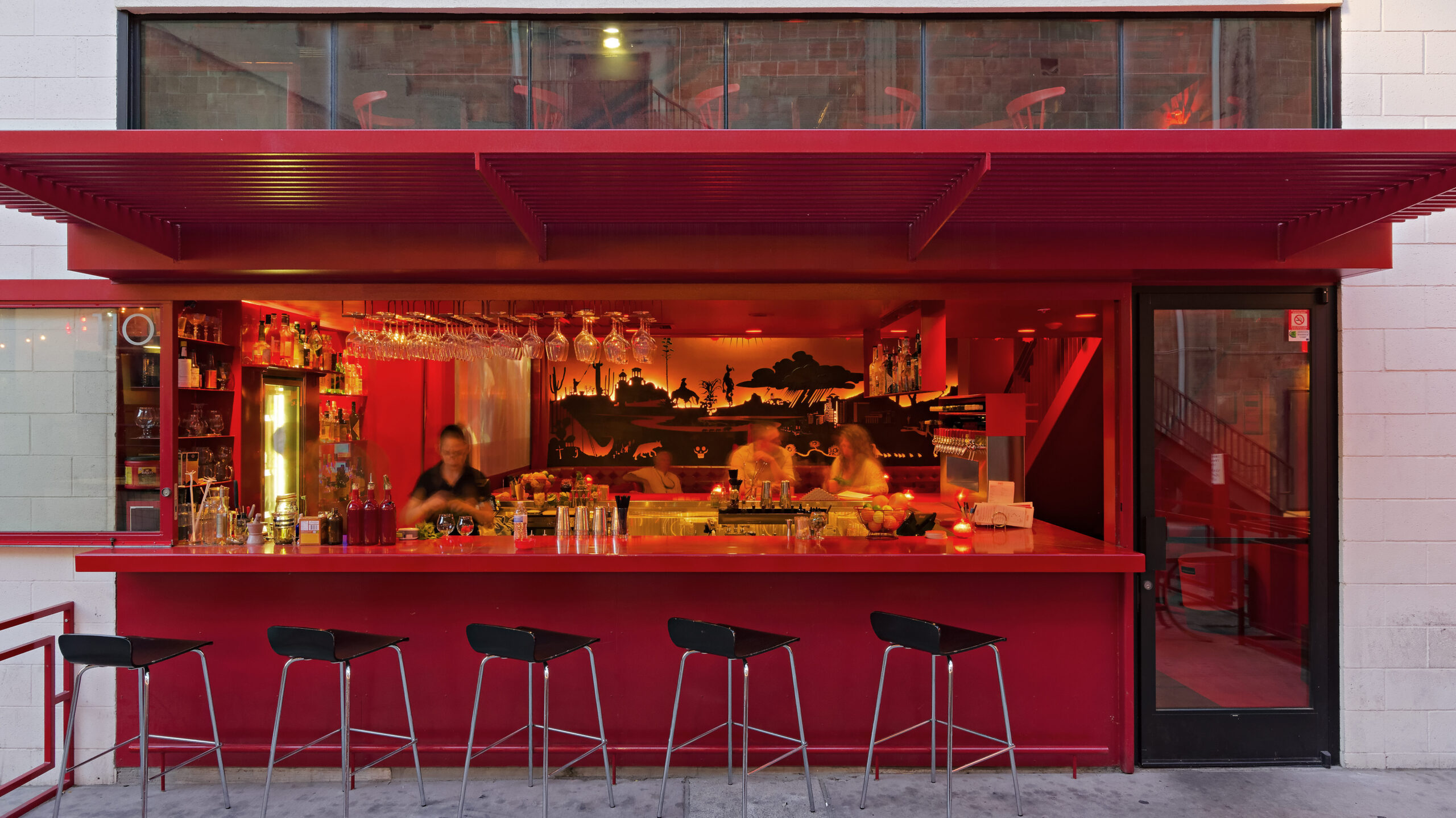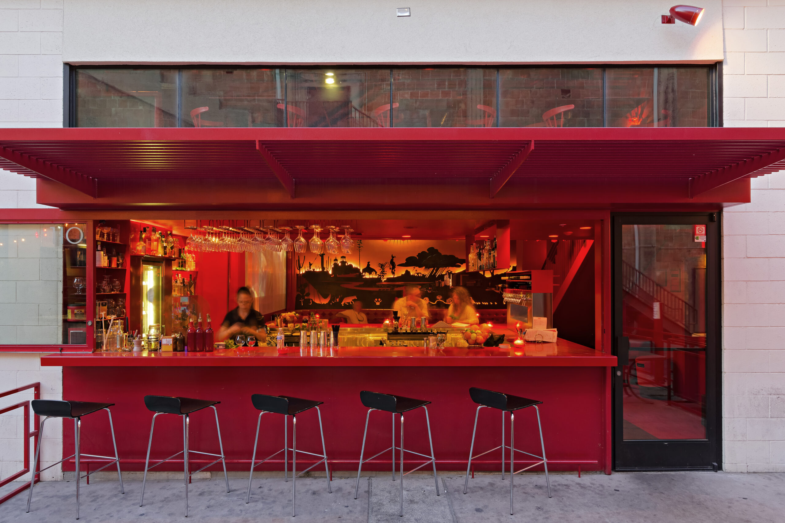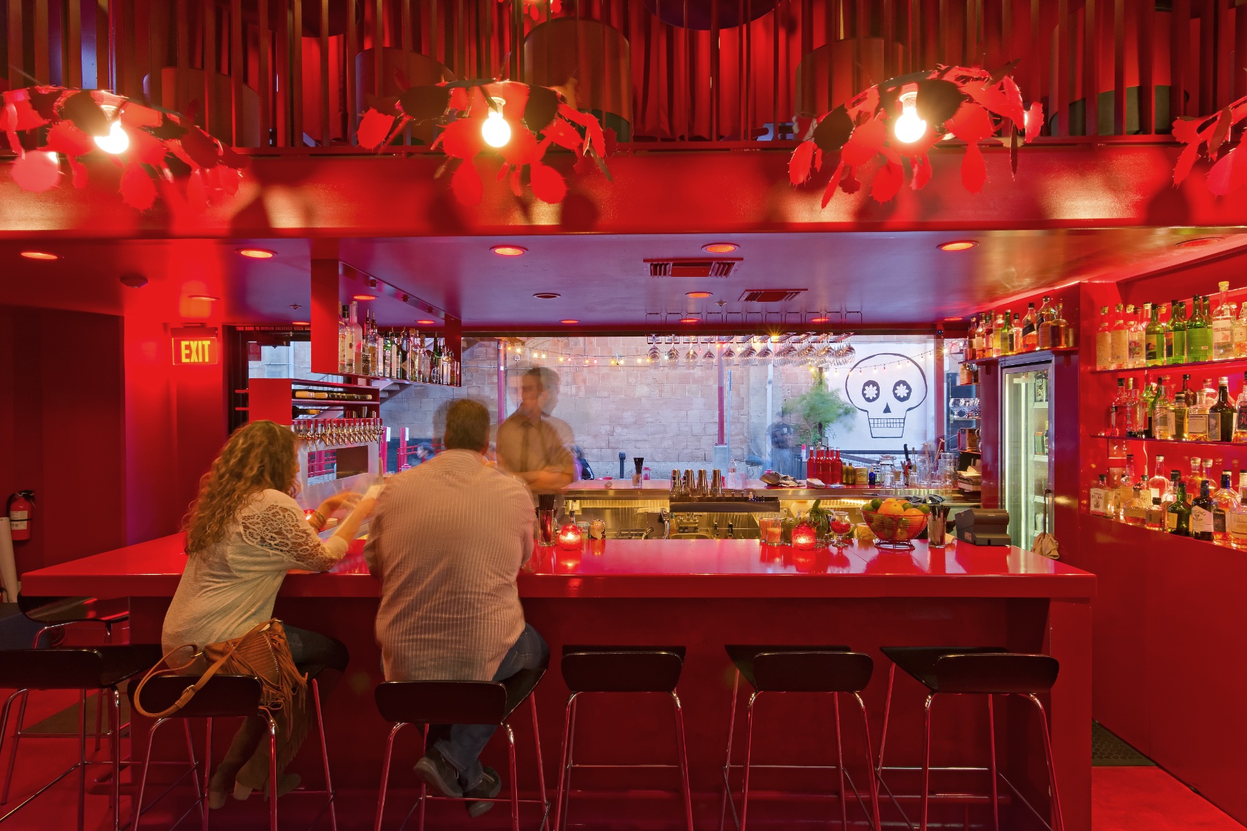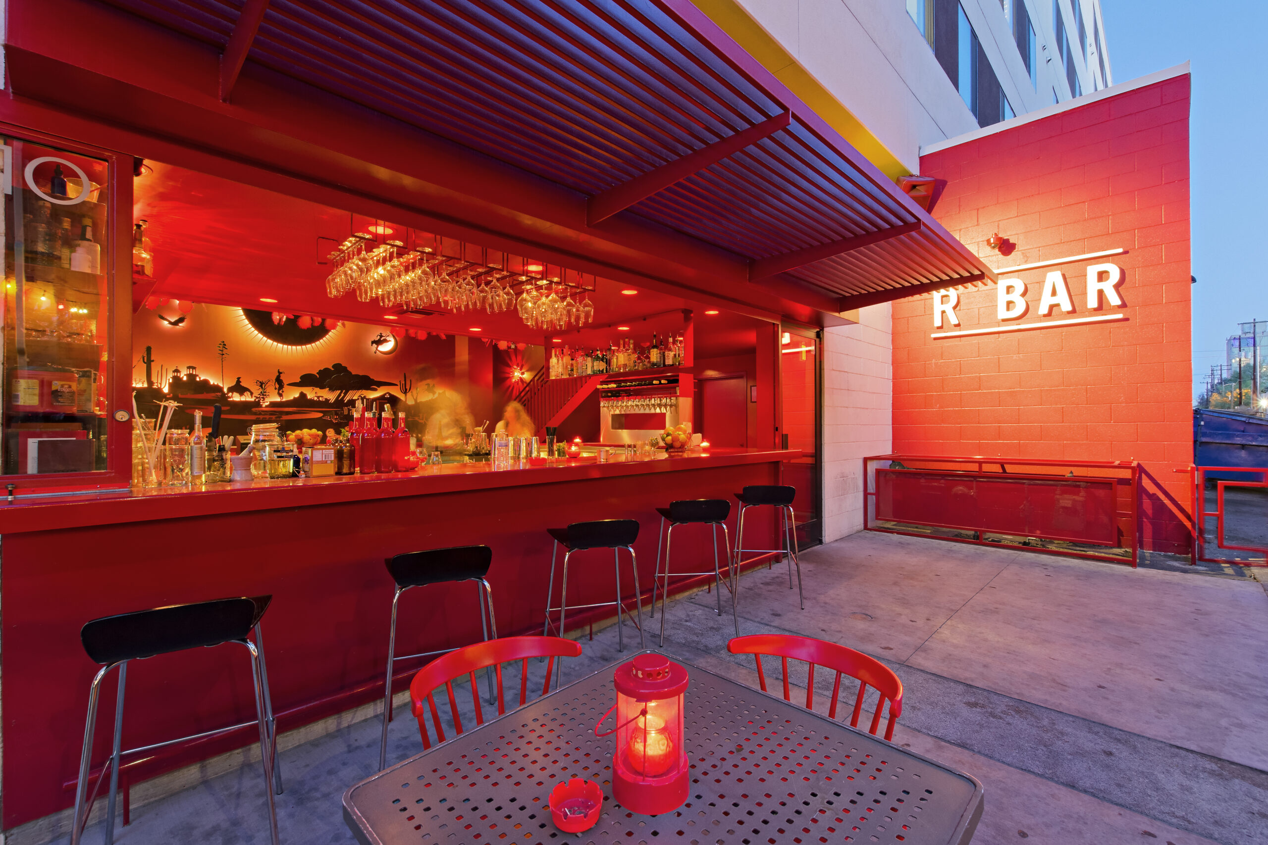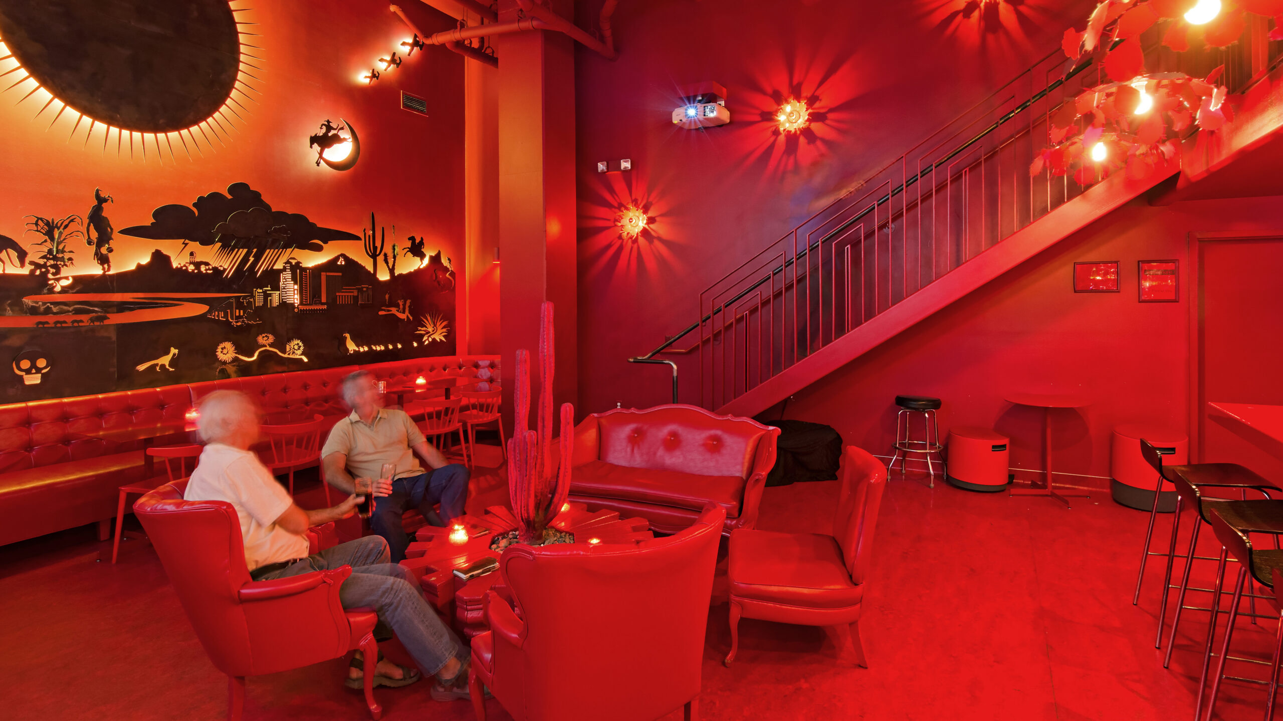 R Bar is the Rialto Theatre’s 7-night-a-week “alley bar” located in downtown Tucson. Patrons enjoy cocktails, beer and wine in a one-of-a-kind, funky-chic, setting. From the floors to the ceiling and everything in between, the entire interior of r bar is painted a rich crimson hue. Custom steel detailing is found throughout the space, with the focal point being “The Story of Tucson”, a 10’ high laser cut steel wall mural depicting notable Tucson landmarks, plants and animals native to the Sonoran desert. The mezzanine level above the bar provides a more intimate setting, while downstairs in the main space. a translucent projection wall shows classic movies every night of the week.