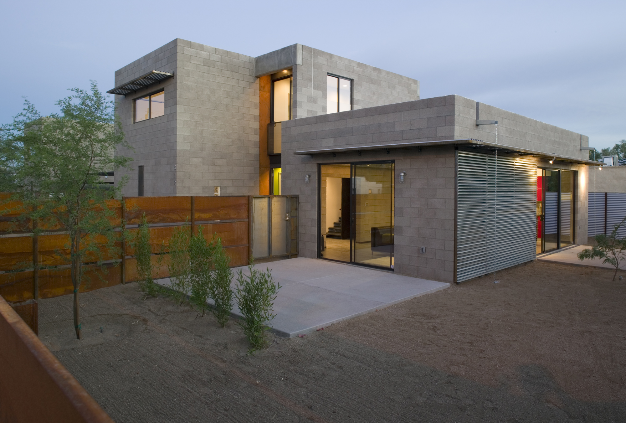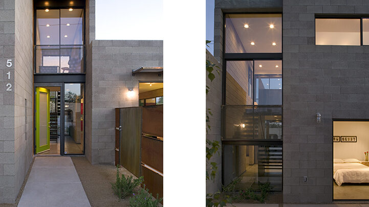 The Double is two single-family homes on adjacent corners of a city block in Tucson’s Barrio Blue Moon. Each house is sited to have a welcoming public entry and extensive private gardens. The entries and front yards are designed to be open to the street and visible from the neighboring houses. A two-story entry featuring a dramatic steel stairway connects the public and private areas of each house. The large, open-plan room that includes the kitchen, dining, and living areas is on one side of the entry. A master bedroom suite and two upstairs bedrooms and bath are in the two-story wing on the opposite side.