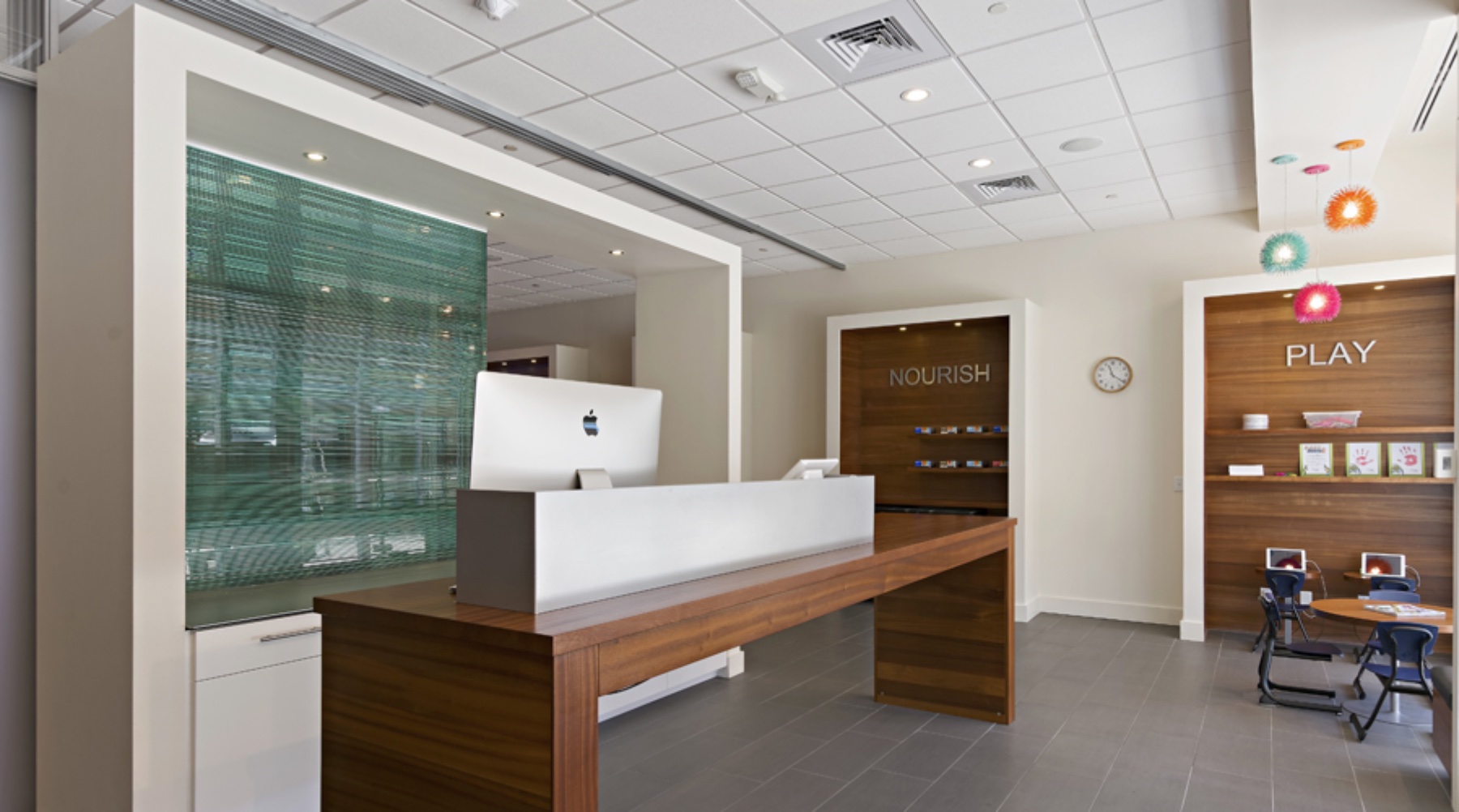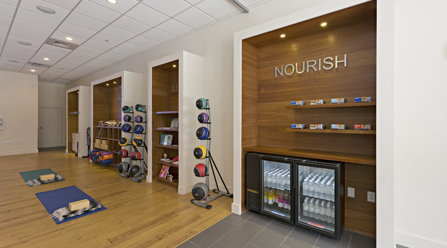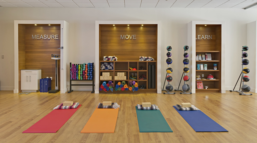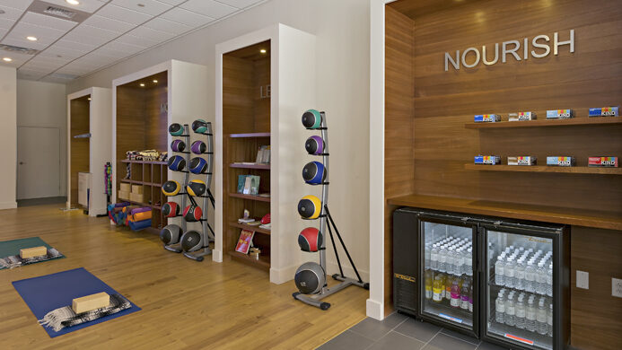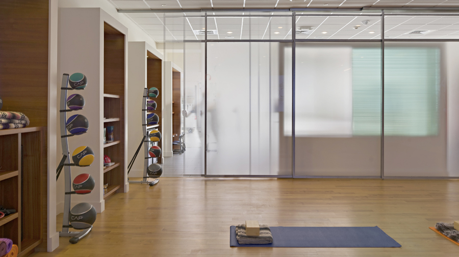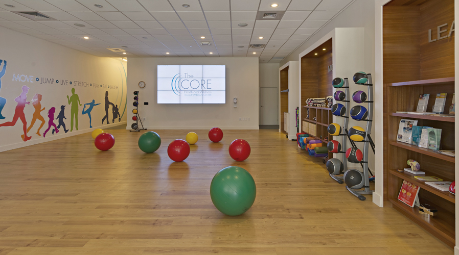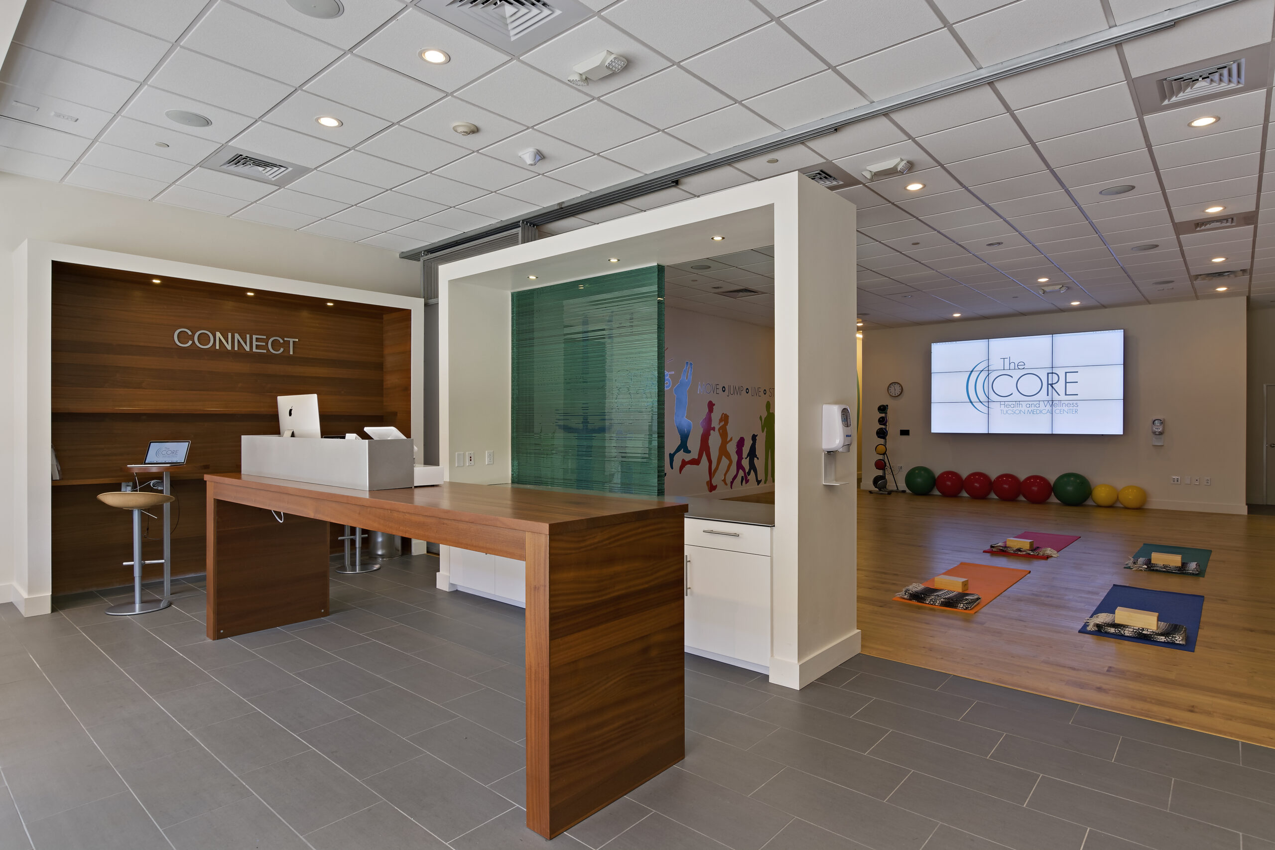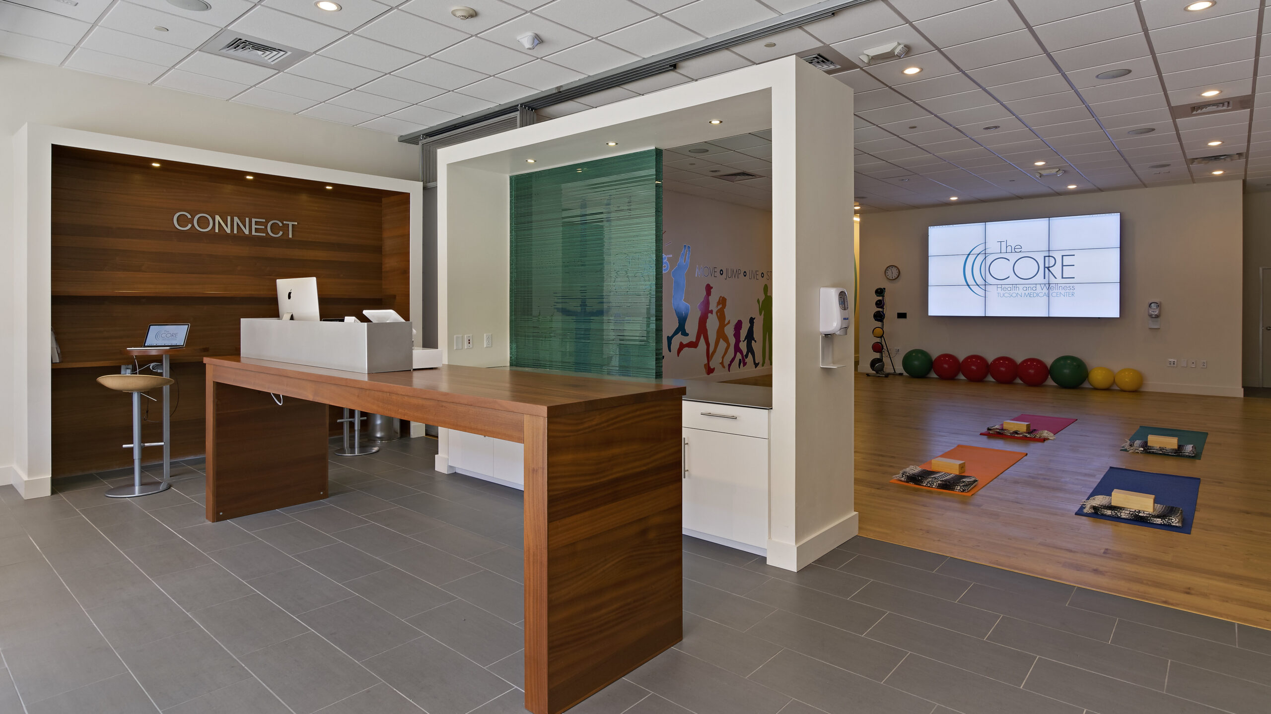 TMC’s “The Core” Wellness Center at La Encantada is a community resource promoting health and wellness in a non-clinical setting. A combination of wood floors, glass and smooth white walls create a comfortably modern setting for wellness screenings, health fairs, fitness classes, lecture series, and much more. Stacked glass in the lobby serves as a visual barrier between the reception area and multi-functional meeting spaces, while allowing diffuse natural light to penetrate throughout the space. Sapele Mahogany clad niches serve as stations for the discrete aspects of the center.